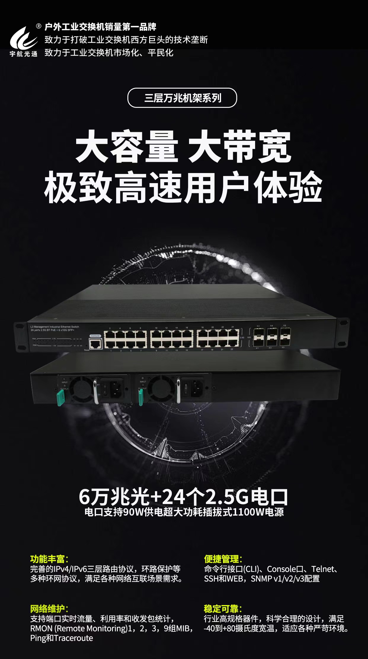 宇航6萬兆+24個2.5G電口工業(yè)交換機(jī)單個端口BT-90W-POE供電,雙電源1100W超大功率,高帶寬、穩(wěn)定可靠、功能豐富、電源冗余、網(wǎng)絡(luò)維護(hù)以及便捷管理等特點,為用戶提供了極致的高速體驗和可靠的網(wǎng)絡(luò)連接。它具有6個10G上行主干光口和24個2.5G電口,可以滿足大規(guī)模數(shù)據(jù)傳輸?shù)男枨?。行業(yè)高規(guī)格器件和科學(xué)合理的設(shè)計,使其能夠適應(yīng)各種嚴(yán)苛的環(huán)境,確保設(shè)備在各種條件下都能穩(wěn)定運行。雙電源模塊,支持AC/DC多種供電方式。支持端口實時流量、利用率和收發(fā)包統(tǒng)計等網(wǎng)絡(luò)維護(hù)功能,更好地監(jiān)控和管理網(wǎng)絡(luò)。