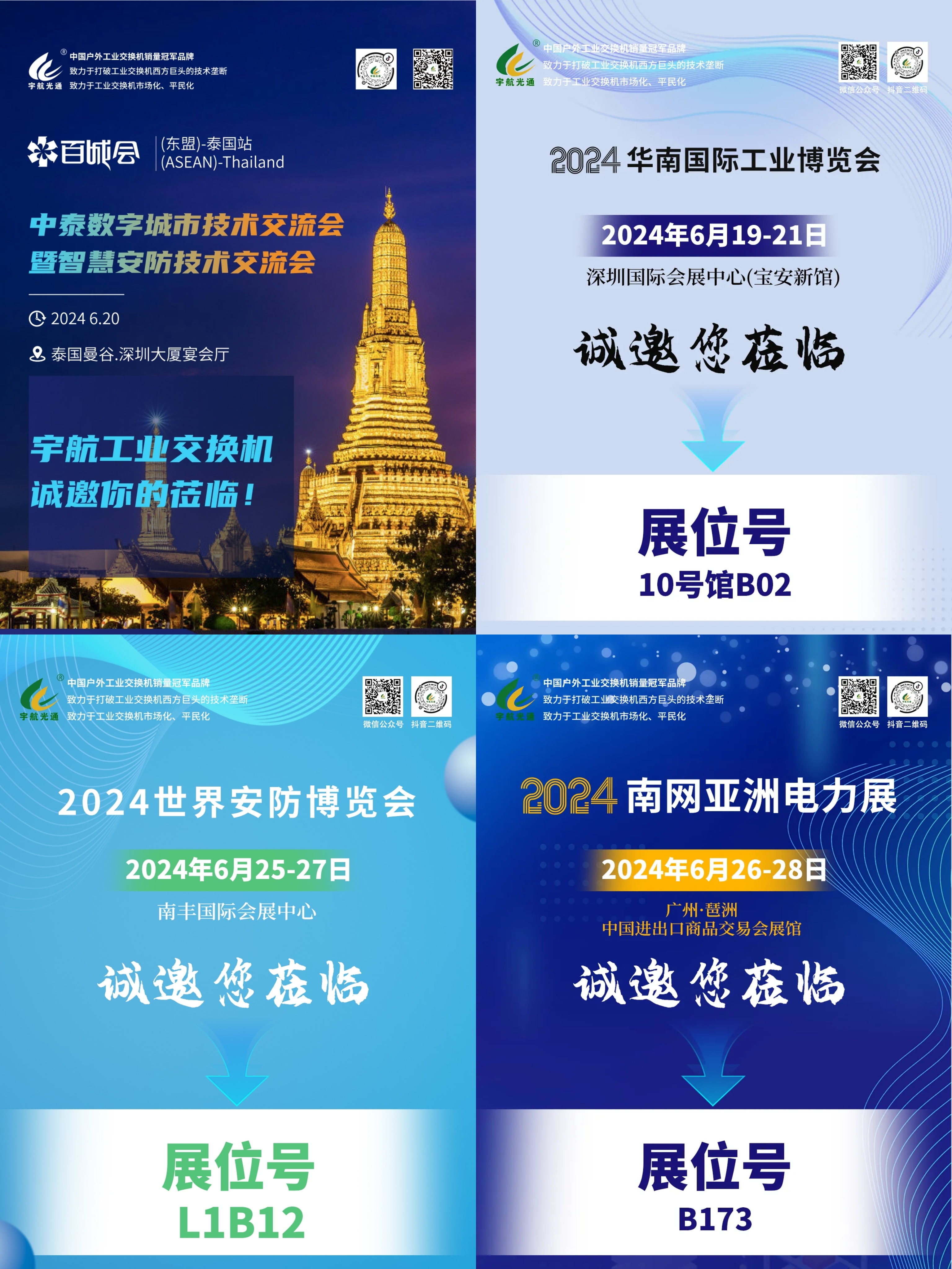 六月下旬,宇航工業(yè)交換機(jī)繼續(xù)與您相約國內(nèi)外各大城市,深圳,泰國曼谷,湖南湘潭,湖北宜昌、恩施、廣西來賓、廣州、上海等地!宇航工業(yè)交換機(jī)期待您的蒞臨!