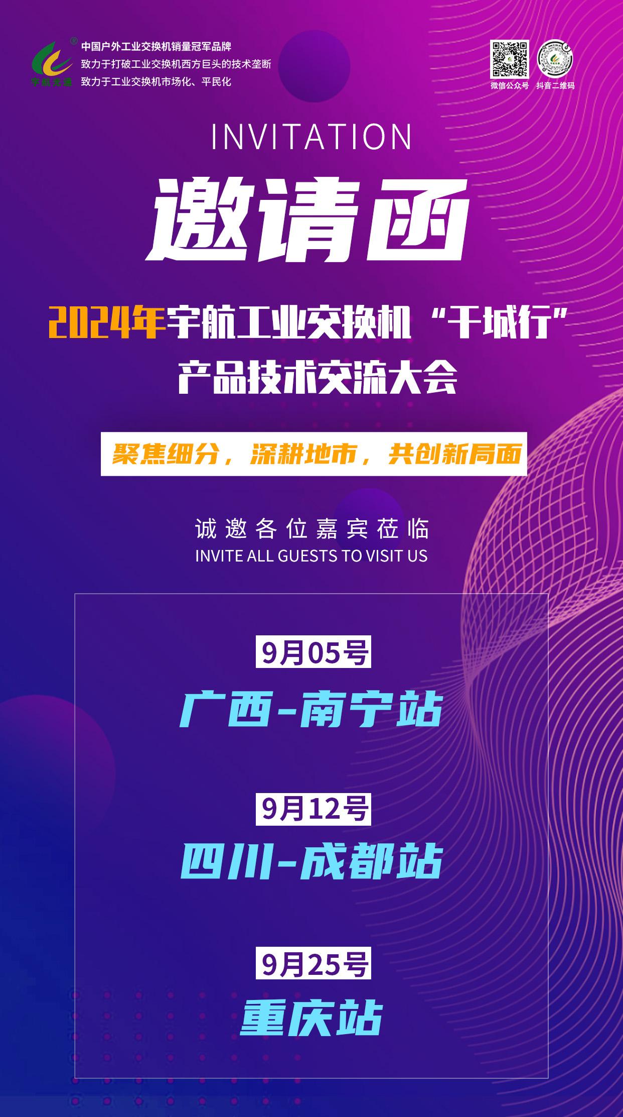 九月,宇航工業(yè)交換機將在重慶、深圳、鄭州等城市亮相行業(yè)各大展會,同時,為深化技術(shù)交流與合作,還將在廣西南寧、四川成都及重慶等地舉辦“2024宇航工業(yè)交換機千城行產(chǎn)品技術(shù)交流大會”,旨在通過這一系列活動,全面展示宇航工業(yè)交換機的卓越性能與創(chuàng)新應(yīng)用,促進產(chǎn)業(yè)上下游的緊密合作,共同推動工業(yè)通信技術(shù)的革新與發(fā)展。屆時,歡迎各位領(lǐng)導(dǎo)嘉賓蒞臨現(xiàn)場,參觀指導(dǎo)!
