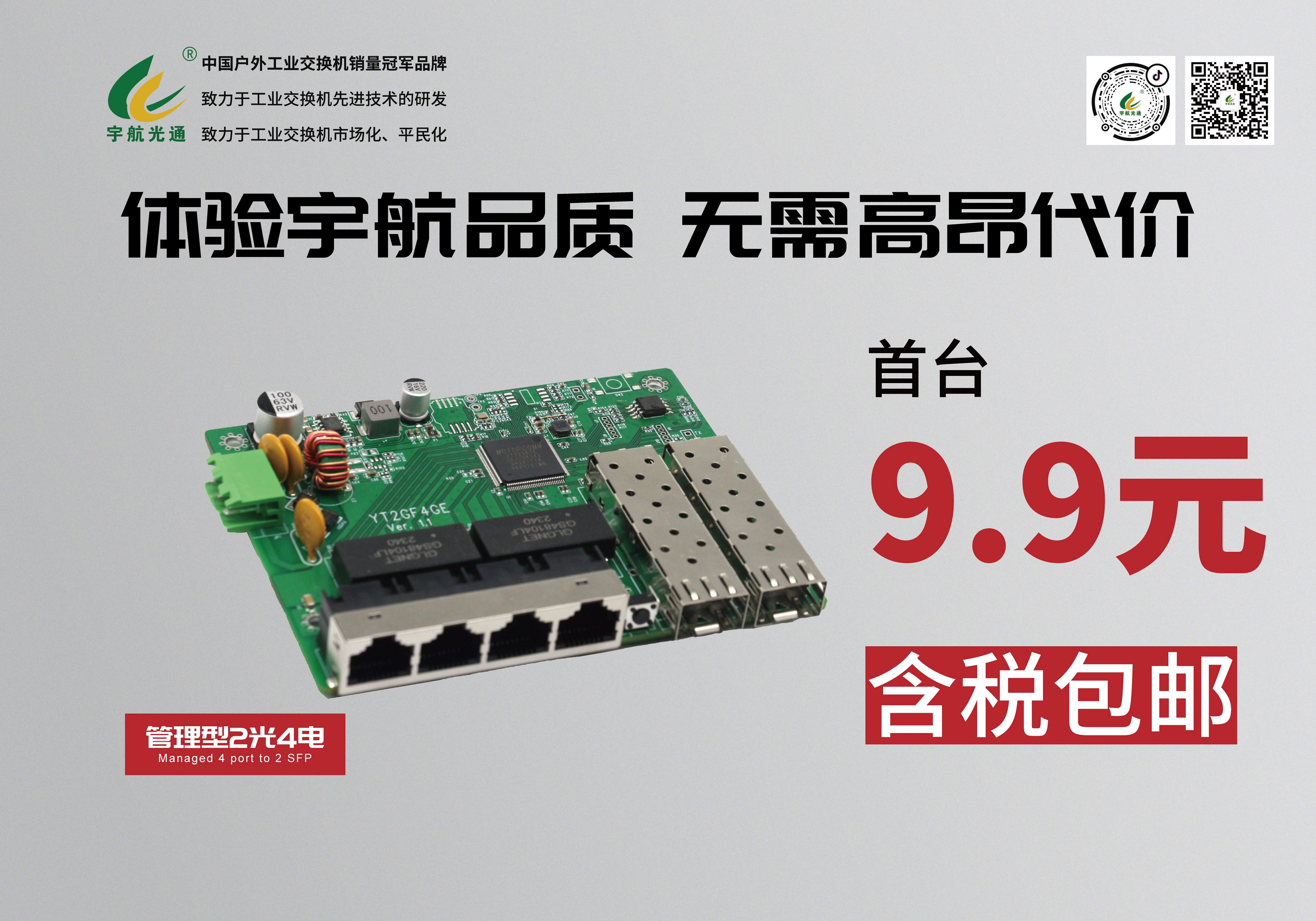 展會上,宇航推出管理型“2光4電”工業(yè)交換機(jī)僅需九塊九包郵的感恩回饋活動,宇航成為市場上第一家推出如此超值工業(yè)交換機(jī)的公司。我們始終致力于為客戶提供高性能、高品質(zhì)的產(chǎn)品,同時堅(jiān)持性價比至上的原則。本次推出九塊九包郵活動,旨在讓更多用戶能夠體驗(yàn)到宇航工業(yè)的卓越品質(zhì),感受我們的技術(shù)創(chuàng)新和誠意。
