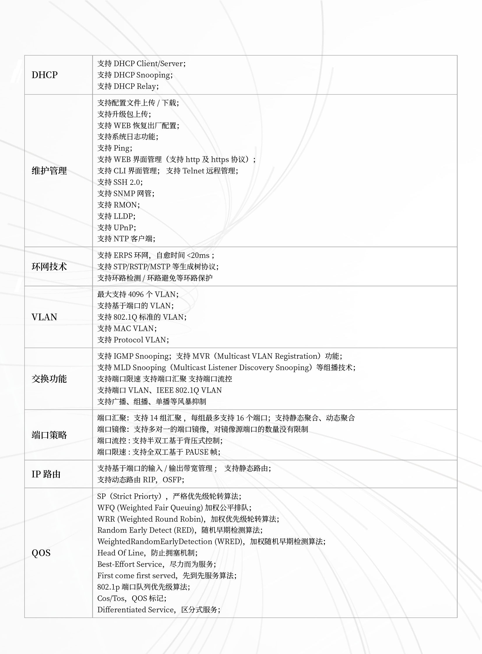 具有L2/L3/L4線速交換能力、具備QoS、帶寬控制、組播等高級(jí)功能,是定位于網(wǎng)絡(luò)核心層、實(shí)現(xiàn)整體網(wǎng)絡(luò)增值的優(yōu)選設(shè)備。同時(shí),提供基于硬件的流量分類(lèi)和組播、速率限制和QoS機(jī)制,為用戶(hù)開(kāi)展增值業(yè)務(wù)提供強(qiáng)大的支持。