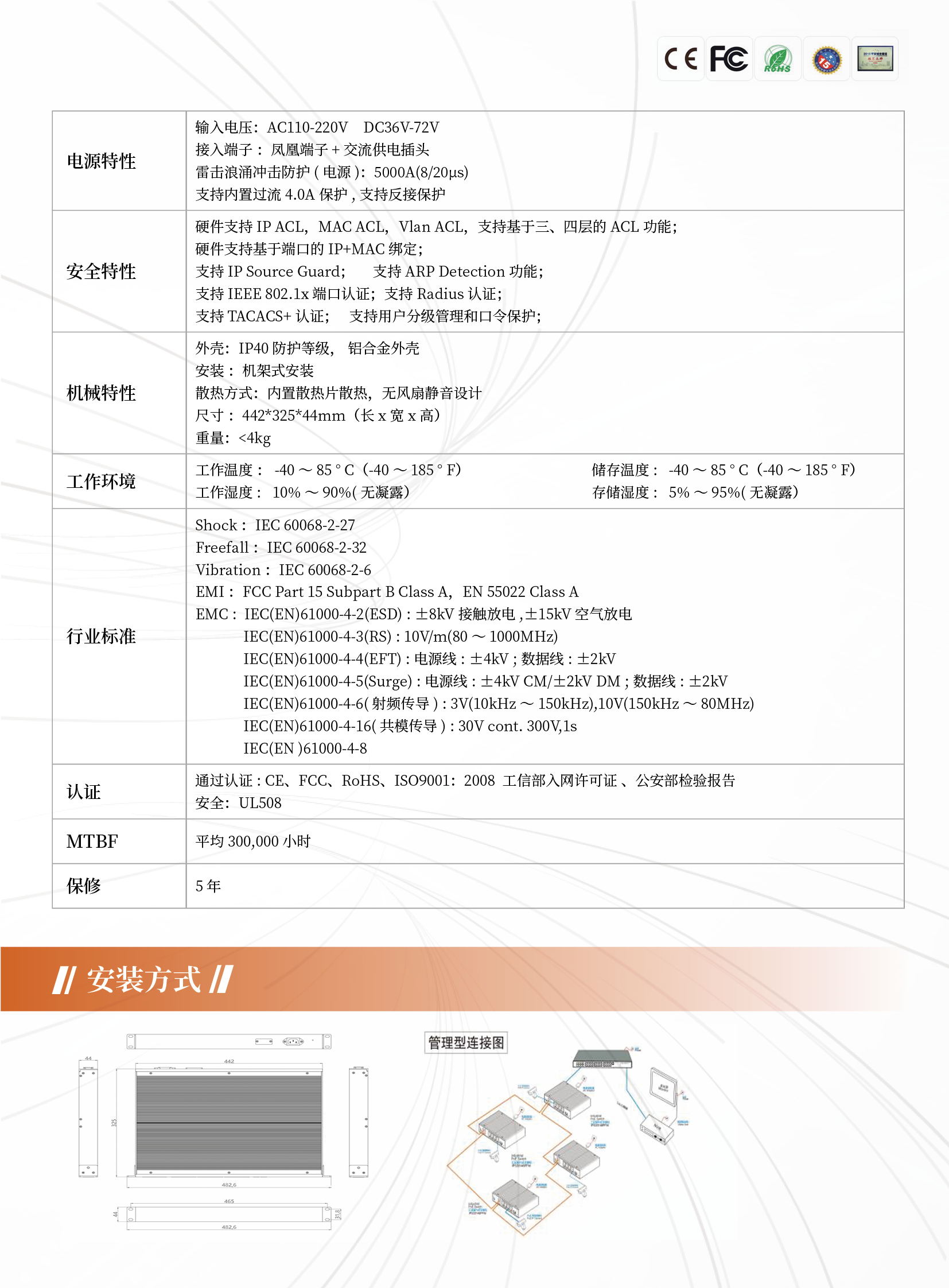 電信級(jí)雙電源冗余保護(hù)、三級(jí)防雷設(shè)計(jì),符合國(guó)際IEC61000-4-5標(biāo)準(zhǔn);符合安規(guī)EN60950、IEC60950標(biāo)準(zhǔn),適應(yīng)各種復(fù)雜安裝環(huán)境及惡劣天氣。