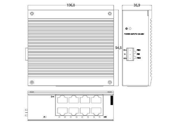 外殼:金屬材質(zhì) 安裝:DIN 卡軌式,壁掛式安裝 重量:0.25Kg 尺寸 :106.8 x 94.5 x 36.9mm(長 x 寬 x 高) |