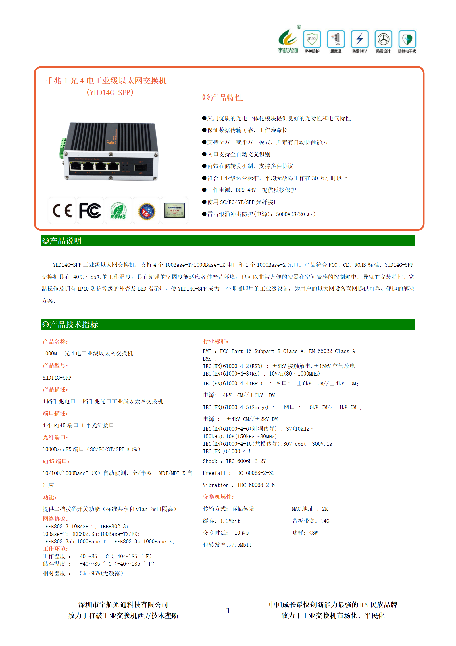 YHD14G-SFP工業(yè)級以太網(wǎng)交換機,支持4個100Base-T/1000Base-TX電口和1個1000Base-X光口。產(chǎn)品符合FCC、CE、ROHS標準。YHD14G-SFP交換機具有-40℃~85℃的工作溫度,具有超強的堅固度能適應(yīng)各種嚴苛環(huán)境,也可以非常方便的安置在空間緊湊的控制箱中。導(dǎo)軌的安裝特性、寬溫操作及擁有IP40防護等級的外殼及LED指示燈,使YHD14G-SFP成為一個即插即用的工業(yè)級設(shè)備,為用戶的以太網(wǎng)設(shè)備聯(lián)網(wǎng)提供可靠、便捷的解決方案。