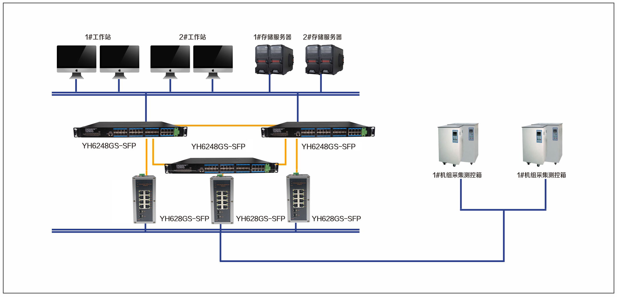 宇航在發(fā)電站集散監(jiān)控系統(tǒng)解決方案中采用了YH6248GS-SFP,YH628GS-SFP.現(xiàn)場數(shù)據(jù)接入層,通過一個接口轉換服務器在DCS的I/O層上,可將現(xiàn)場數(shù)據(jù)信息映射成DCS的I/O總線上的數(shù)據(jù)信息,使DCS控制統(tǒng)一集成。數(shù)據(jù)通信層采用主控制系統(tǒng)1#2機組成的冗余環(huán)網信息,上行通過宇航千兆工業(yè)以太網交換機連接工作站,工程師站以及服務器等,下行通過千兆以太網交換機YH628GS連接控制管理主機站等,實現(xiàn)整個系統(tǒng)的冗余結構,包裝數(shù)據(jù)傳輸?shù)目煽啃?,穩(wěn)定性。